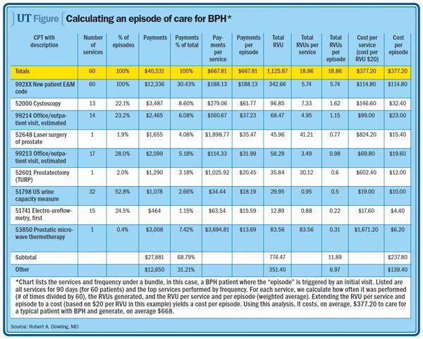 Next, you need to understand what services to include in the bundle or “episode of care.” For example, if you were constructing a model for BPH patients, you might want to include the initial visit and subsequent services within 90 days in your “episode.” To understand your historical experience with these types of patients, you can mine your practice management data and determine all the services you typically render to your patients after a new patient visit where BPH is the principal diagnosis, and with what frequency. Each service can then be assigned a “cost” based on RVUs, and extended to a cost per episode. That analysis might look like the example depicted by the figure below.