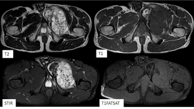 The bulk of the tumor is noted to protrude into the medial aspect of the left upper thigh, elevating the gracilis and adductor muscle with altered signal intensity (hyperintense on T2WI, STIR) within it. On post-contrast study, the lesion shows heterogeneous enhancement.