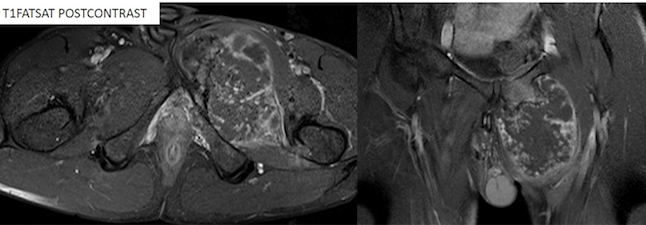Figure 3. A large intramedullary mass lesion is noted arising from the body and near a portion of the left superior and inferior pubic rami. The lesion appears hyperintense on T2WI, STIR and hypointense on T1WI. The lesion has a short bony stalk with direct continuation with the underlying bone.