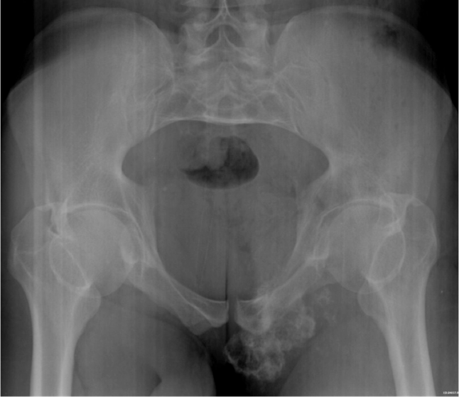 A large lytic expansile mass lesion was noted arising from the pubic bone causing underlying cortical expansion and destruction with narrow zone of transition. The lesion shows a central internal ring and arc calcification to suggest chondroid matrix.