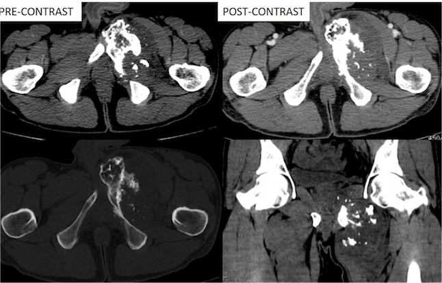 Figure 2. A large lytic expansile mass lesion arising from pubic bone causing underlying cortical expansion and destruction with narrow zone of transition. Central internal ring and arc calcification is also seen.