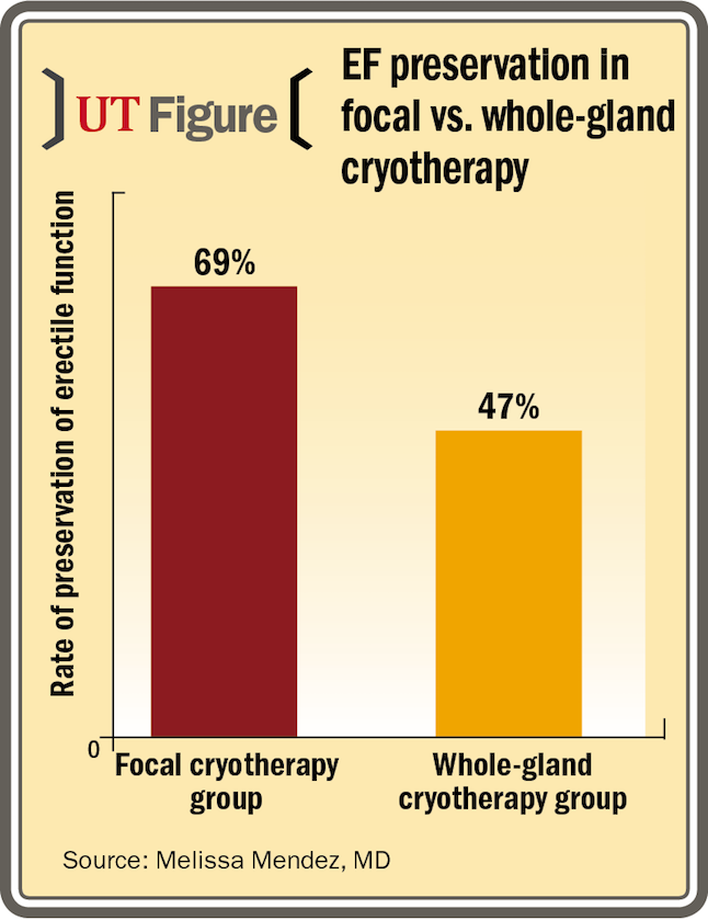 Dr. Mendez noted that a limitation of the COLD registry is that cryoablation is categorized only as partial gland or whole gland, so there is not granularity to delineate types of focal therapy in terms of whether it was performed as a targeted focal ablation or a hemi-gland approach. She suggested that the majority of men included in the study’s focal therapy group probably had hemi-gland treatment, which may explain why the erectile function preservation rate was not higher than 69%.