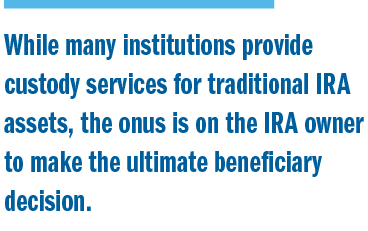 Individual retirement accounts (IRAs) generally represent most physicians’ largest financial asset. With this in mind, it only makes sense to ensure that retirement account beneficiary decisions are carefully made. While many institutions provide custody services for traditional