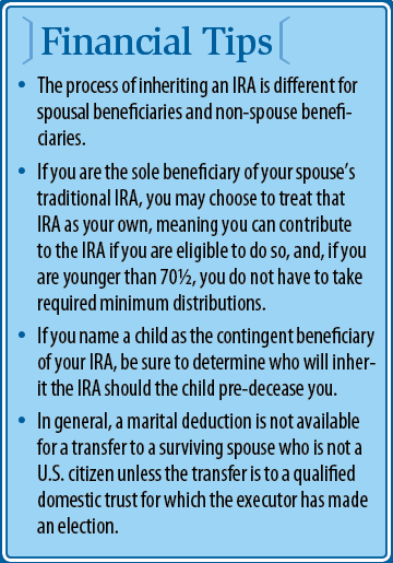 If you are the sole beneficiary of your spouse’s traditional IRA, you may choose to treat that IRA as your own. This means you can contribute to the IRA if you are eligible to do so, and, if you are younger than 70½, you do not have to take required minimum distributions (RMDs). RMDs are generally required after reaching age 70½. As an alternative, you may leave the IRA in your spouse’s name with you as the beneficiary. If your deceased spouse died after age 70½, you generally must base subsequent RMDs on the longer of your single life expectancy or the deceased’s life expectancy. Otherwise, distributions may be based on your single life expectancy or the account must be totally liquidated in 5 years. Another possible option is to roll over the inherited IRA assets into your own IRA. The rollover is exempt from current tax liability if completed within 60 days.