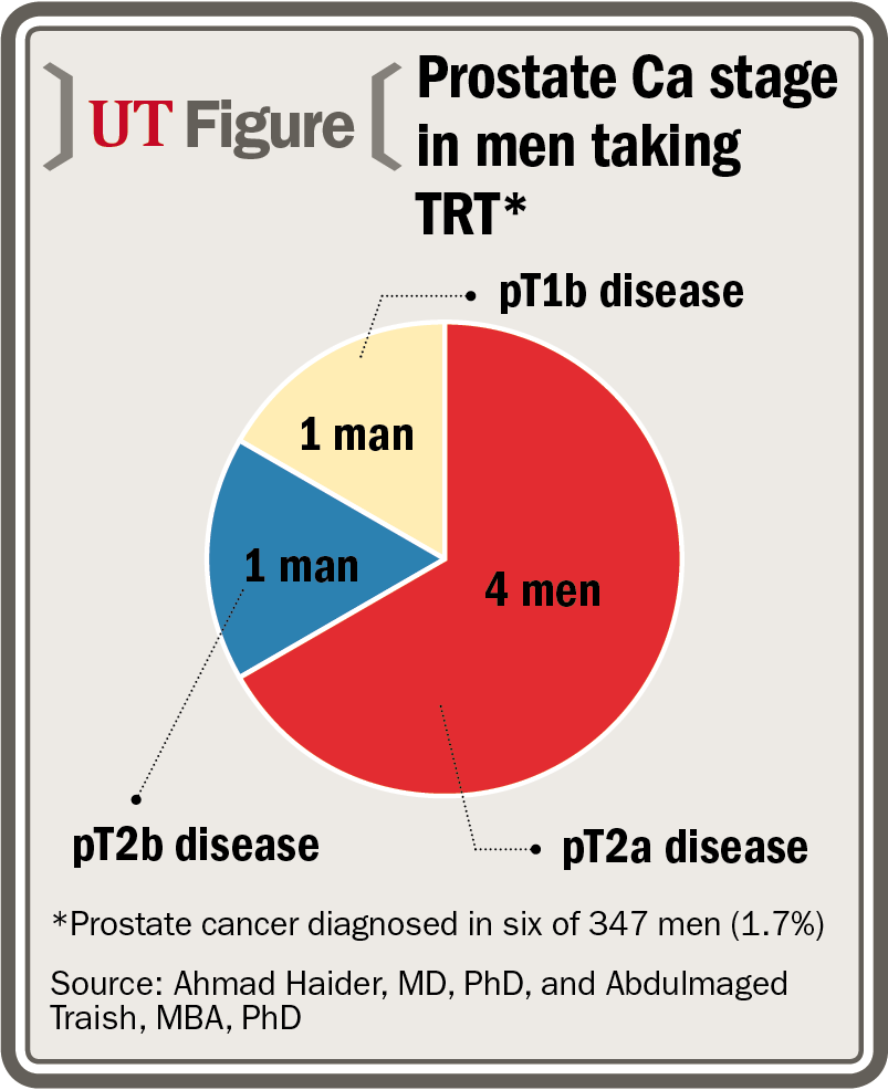 All patients underwent radical prostatectomy. Pathologic T stage was pT2a in four men, pT2b in one, and pT1b in one. TRT was temporarily interrupted, but resumed by five of the six men, Dr. Haider reported.