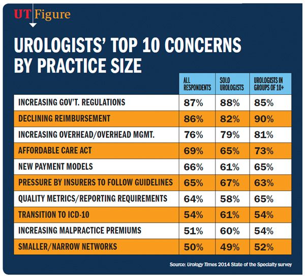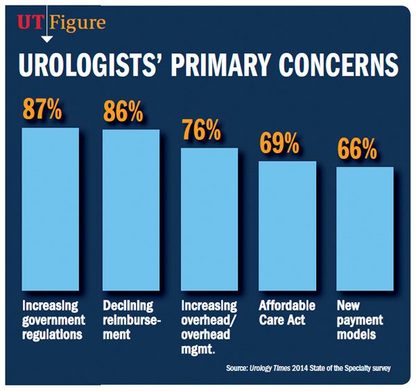 Urologists listed increasing government regulations, declining reimbursement, increasing overhead, and the Affordable Care Act as their most pressing concerns in Urology Times’ 2014 State of the Specialty survey.