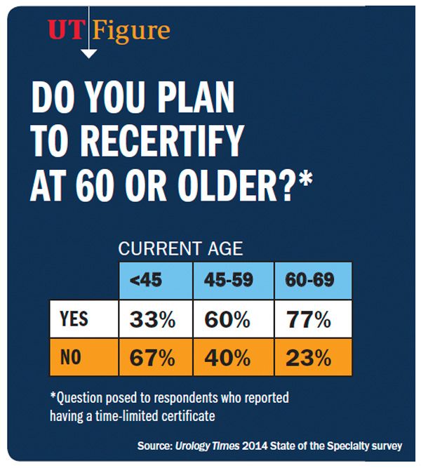 In another finding that could impact the urology work force, only one-third of urologists who are currently age 45 or younger and have a time-limited certificate from the American Board of Urology (ABU) plan to recertify when they reach age 60.