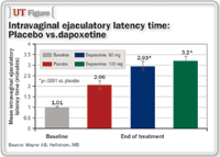 The randomized, double-blind, placebo-controlled trial enrolled 166 adult, heterosexual men with a baseline intravaginal ejaculatory latency time (IELT, as measured by a stopwatch held by the female partner) <2 minutes (mean time, 1.01 minutes). Subjects were randomized to initial treatment with dapoxetine, 60 mg or 100 mg taken 1 to 2 hours prior to anticipated sexual activity, or placebo. Patients were crossed over to both alternate treatments. Treatment periods lasted 2 weeks and were separated by a 72-hour washout period.