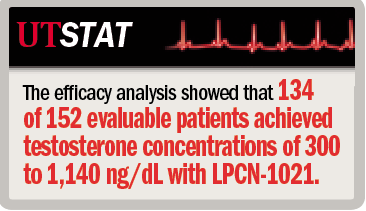 The efficacy analysis of the trial showed that 134 of 152 evaluable patients achieved testosterone concentrations of 300 ng/dL to 1,140 ng/dL with the agent, known as LPCN-1021, and maintained the levels with continued treatment. In 17 cases (11.2%), the 24-hour average concentration dipped below 300 ng/dL, and one patient (0.7%) had a 24-hour average concentration that exceeded 1,140 ng/dL.