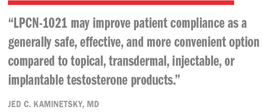 LPCN-1021 employs a novel lipid-like oral delivery technology that allows twice-daily dosing associated with improved solubility, high drug-loading capacity, improved bioavailability, and faster, more consistent absorption that leads to less variability, said Dr. Kaminetsky. The attributes could help improve adherence by avoidance of undesirable characteristics of other TRT formulations, he said.