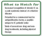 In Atlanta, urologists will hear about new potential treatments for IC pain. For example, ajulemic acid, or IP 751, is a cannabinoid that produces analgesia without a "high" and is in clinical trials for neuropathic pain. Now it's being tried in animal models of IC with a liposome delivery vehicle and apparently reduces the pain response to bladder irritation. Even the liposomes themselves seem to calm bladder hyperactivity and may be more effective than DMSO (Rimso-50) instillation or pentosan polysulfate (Elmiron).