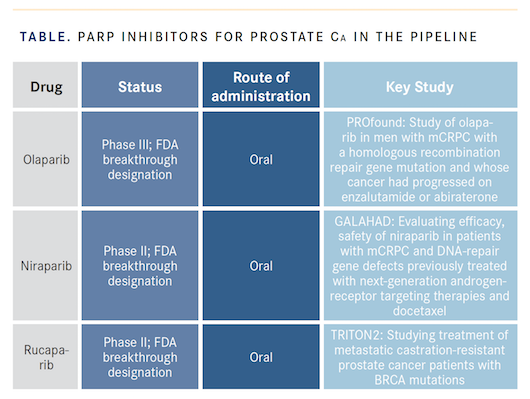 Among the poly (ADP-ribose) polymerase inhibitors (PARP inhibitors) that are in phase II or III trials for advanced prostate cancer, the furthest along and the only one with phase III data is olaparib (Lynparza). AstraZeneca and Merck announced positive results in early August from the phase III PROfound trial of olaparib in men with metastatic castration-resistant prostate cancer with a homologous recombination repair gene mutation and whose cancer had progressed on hormonal anticancer treatment with enzalutamide (XTANDI) or abiraterone acetate (Zytiga). Olaparib has been granted FDA breakthrough designation for BRCA1- and BRCA2-mutated metastatic castration-resistant prostate cancer.