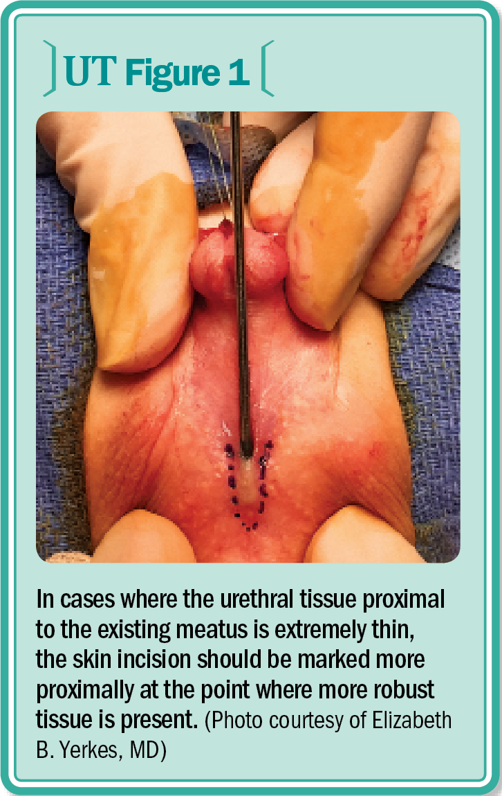 The importance of properly planning the initial skin incisions cannot be overstated. After placing a glans retraction suture, we pass an 8F bougie à boule to gauge the quality of urethral tissue proximal to the existing meatus. In some cases, this tissue is nearly see-through, and the skin incision should be marked more proximally at the point where the tissue is no longer paper thin, allowing for cutback of the urethra to this point (figure 1).
