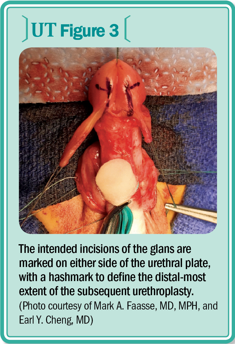 Once the penis is straight, attention is turned to preparation of the urethroplasty. For hemostasis, a tourniquet may be applied or the glans can be injected with lidocaine/epinephrine along either side of the urethral plate. We mark the intended incisions of the glans on either side of the urethral plate with a hashmark to define our intention for the distal-most extent of the subsequent urethroplasty