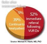 Another question about referral patterns showed that only a slim majority of the respondents, 52%, referred a child to a pediatric urologist immediately after diagnosis of VUR. Nine percent said they referred a child with VUR to a specialist after initial treatment fails, while 39% said they continued to treat children with VUR themselves, potentially even if they were refractory to treatment.