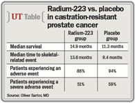 Data presented at the AUA annual meeting in Atlanta showed that radium-223 dichloride (Alpharadin) improved overall survival in patients with CRPC by 30.5%. Patients receiving treatment had a median survival of 14.9 months compared to 11.3 months in the placebo group (p=.0007).