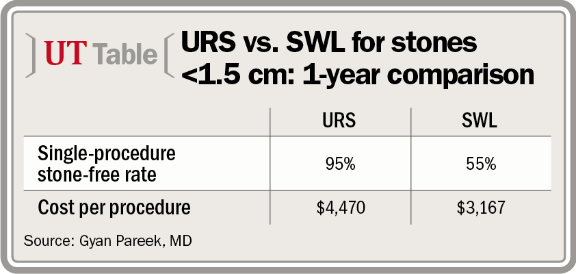 The authors found that the single-procedure stone-free rate at 1 year for SWL was only 55% compared to 95% for URS. Cost per procedure was $3,167 for SWL compared to $4,470 for URS. The researchers’ decision analysis modeling indicated cost effectiveness of SWL when stone-free rates were 65% to 67%. For URS, cost effectiveness was estimated to occur when stone-free rates were 72% to 84%.