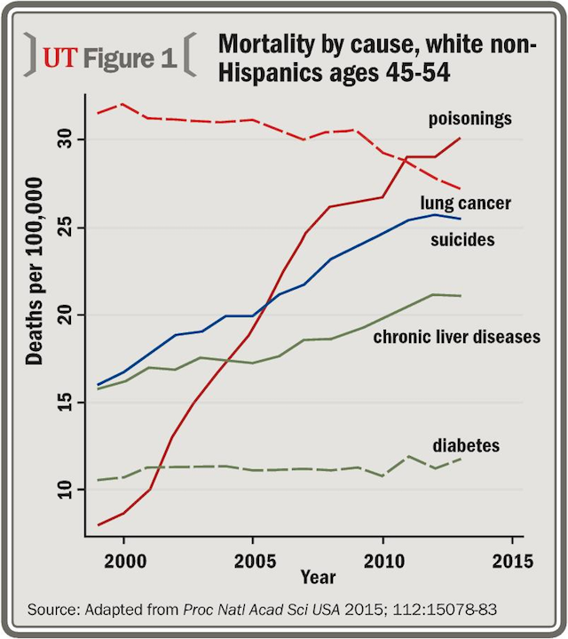A closer look at the middle-aged Caucasian Americans population has led to some interesting trends, as reported by Princeton economist Angus Deaton, who won a Nobel Prize in 2015 for his work. For all other races in America and in other industrial nations, middle-aged death rates have been consistently decreasing. But from 1999 to 2013, all-cause mortality for middle-aged white Americans increased significantly. The largest increase in mortality was seen with poisonings (drug overdose), suicides, and chronic liver disease (figure 1)
